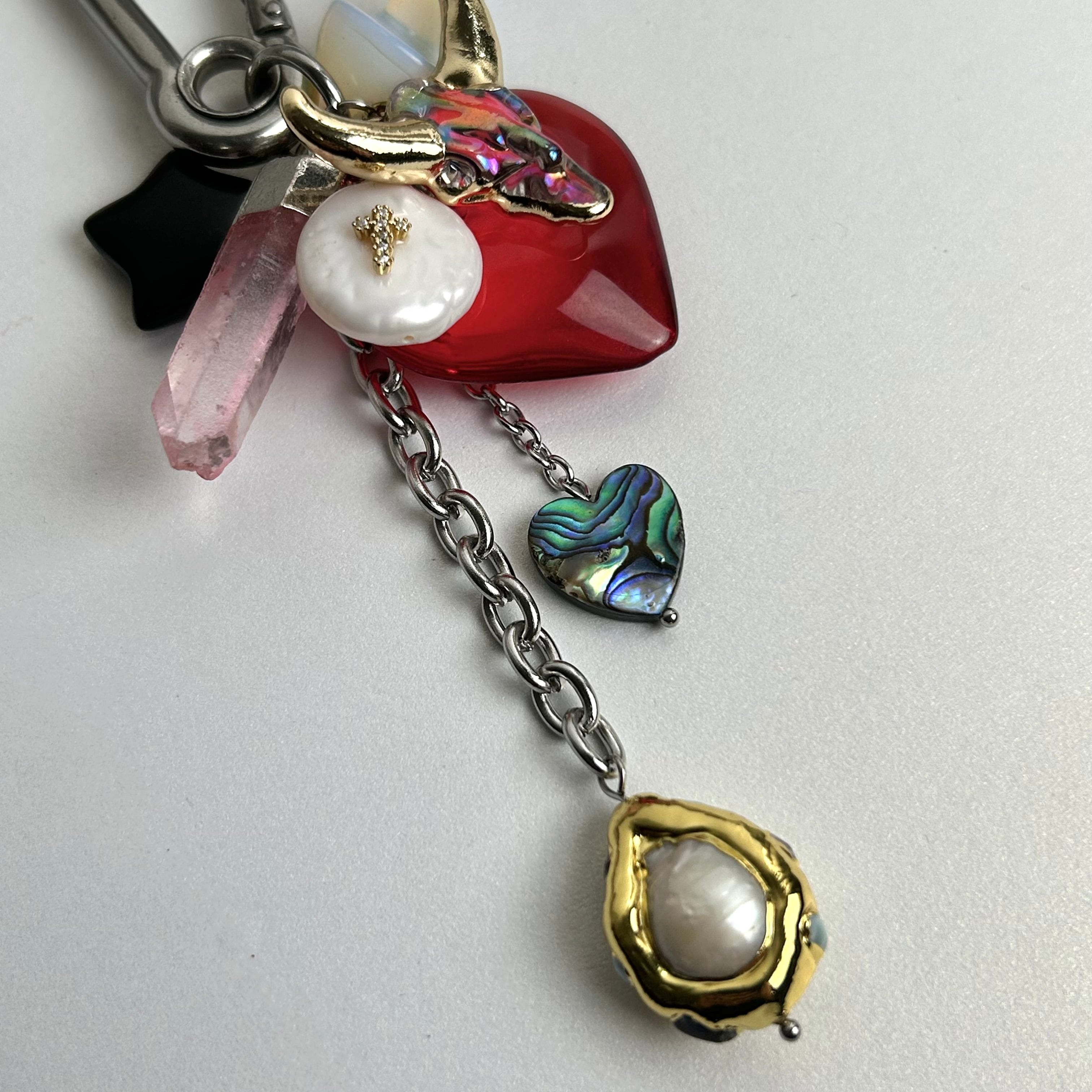 ⚪︎全長約16cm ⚪︎素材:カラビナ→ステンレス鋼 その他→ステンレス、一部真鍮、鉄、合金含む。天然石、淡水パール、ガラス、シェル