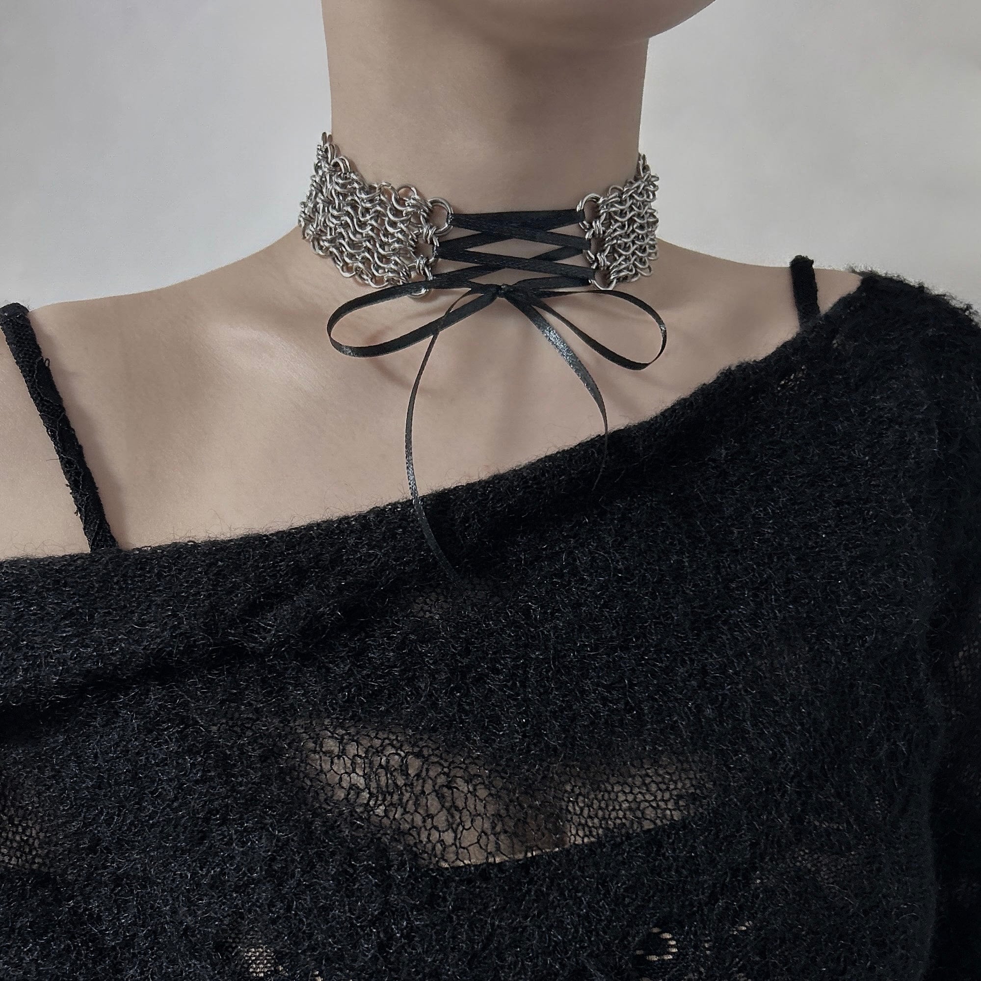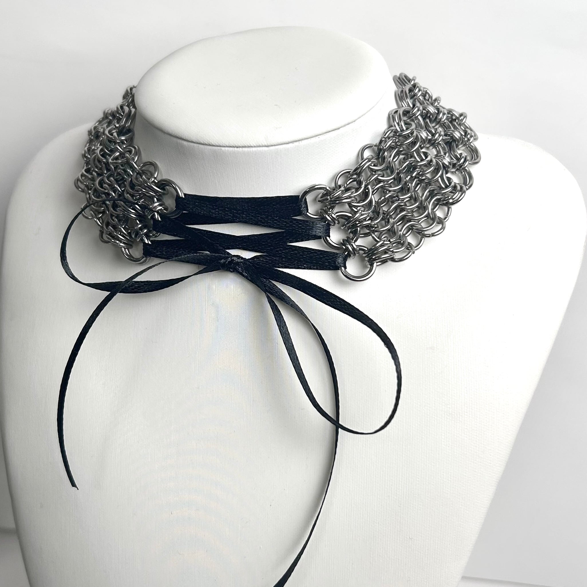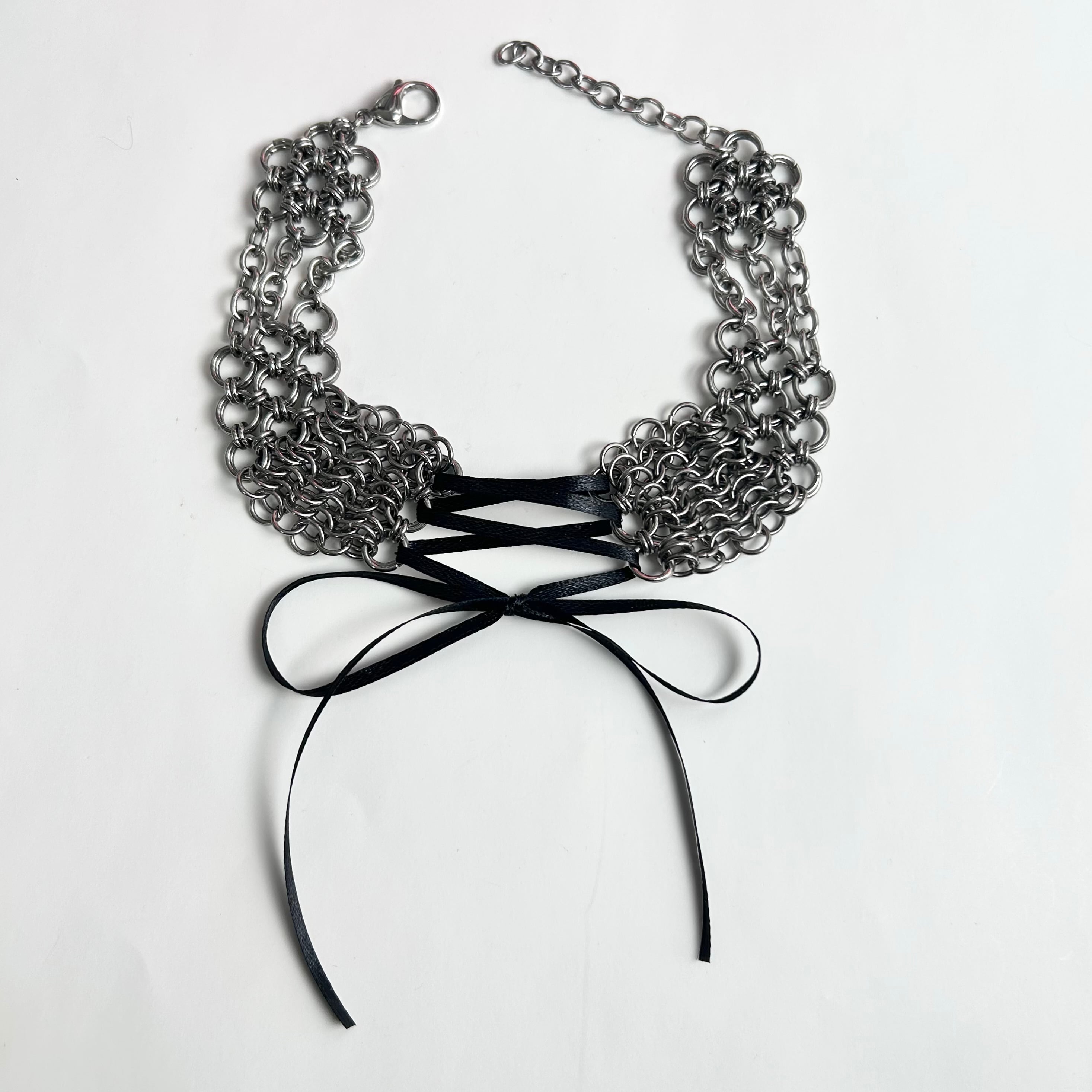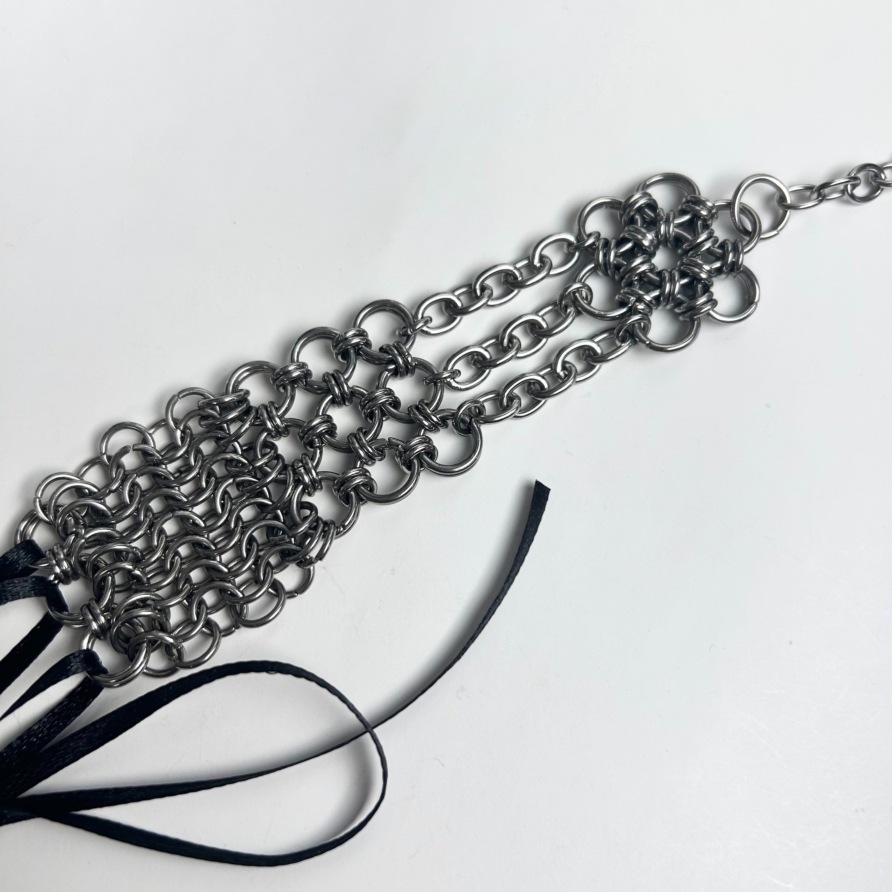 ひとつひとつ丸カンを手作業で開閉し編んでいくchainmailを取り入れております。